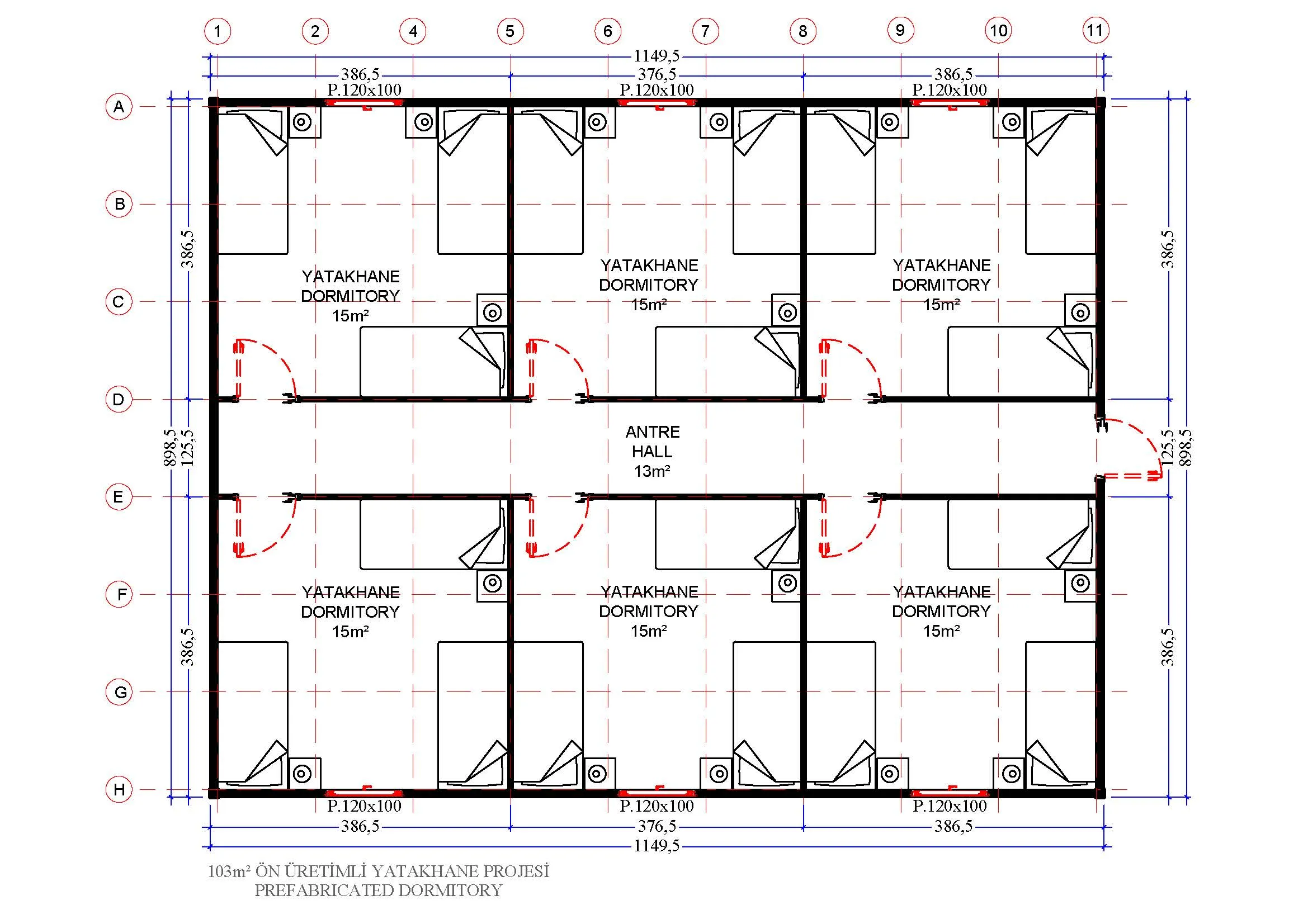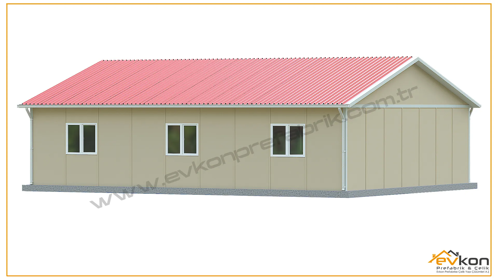 103 metrekare prefabrik yatakhane, küçük ölçekli projeler veya özel ihtiyaçlar için hızlı ve pratik bir barınma çözümüdür. İhtiyaç duyulan temel yaşam alanlarını minimum sürede sağlar.