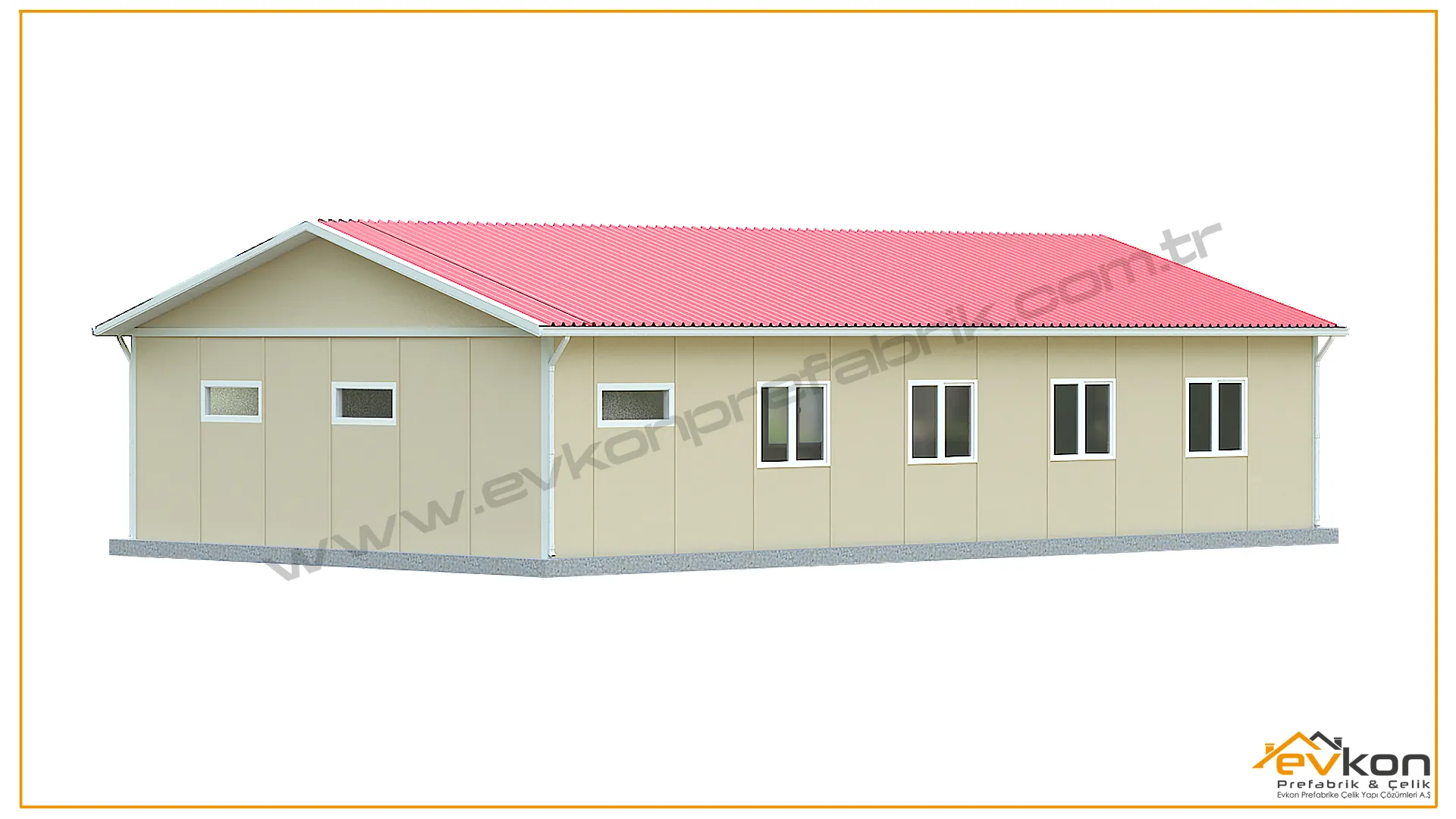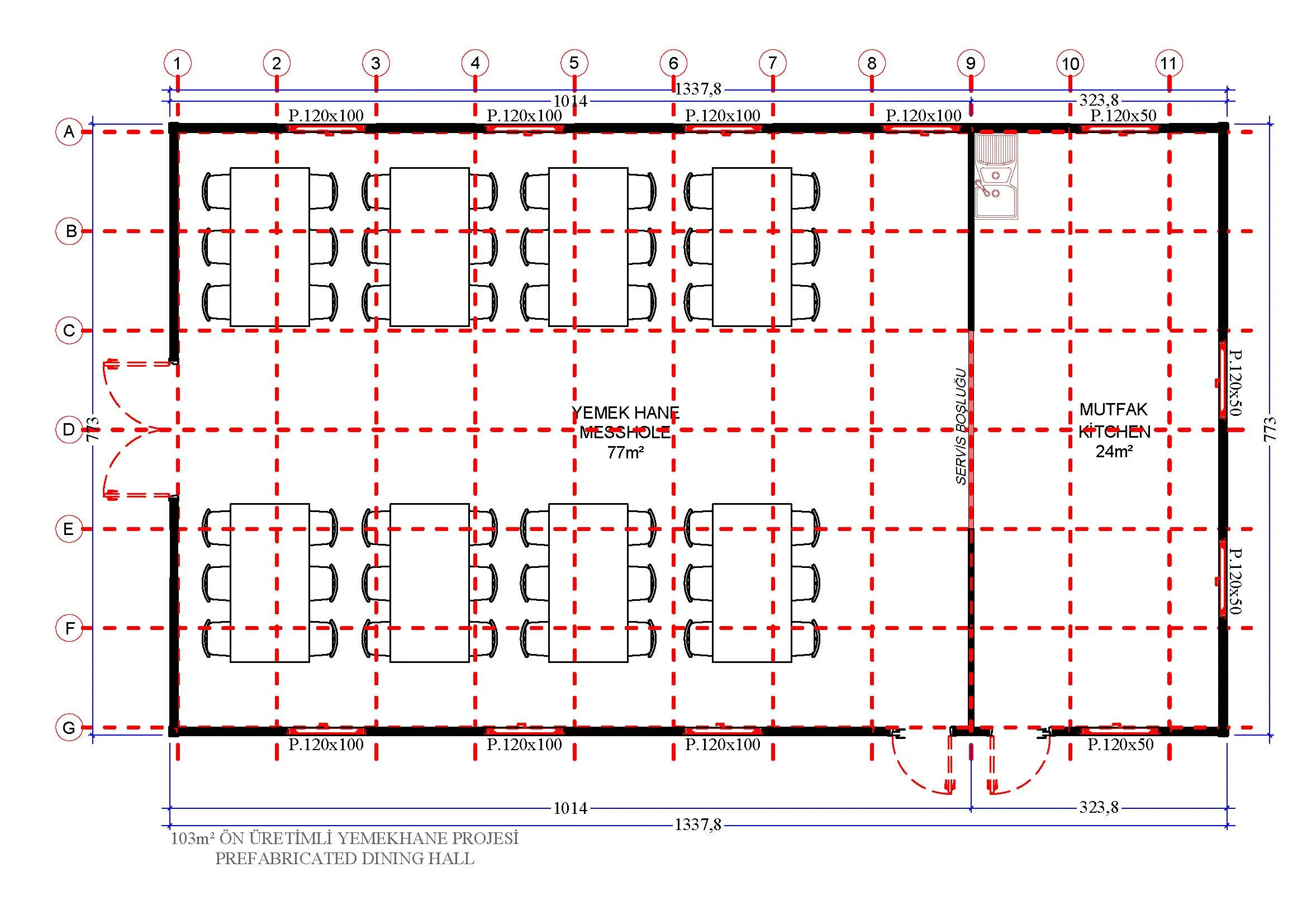 103 metrekare prefabrik yemekhane, 100 m² eşiğini aşarak daha geniş bir personel grubunun veya öğrenci topluluğunun toplu yemek ihtiyacını karşılamak üzere tasarlanmıştır. Geniş ve ferah yemek alanı sunar.