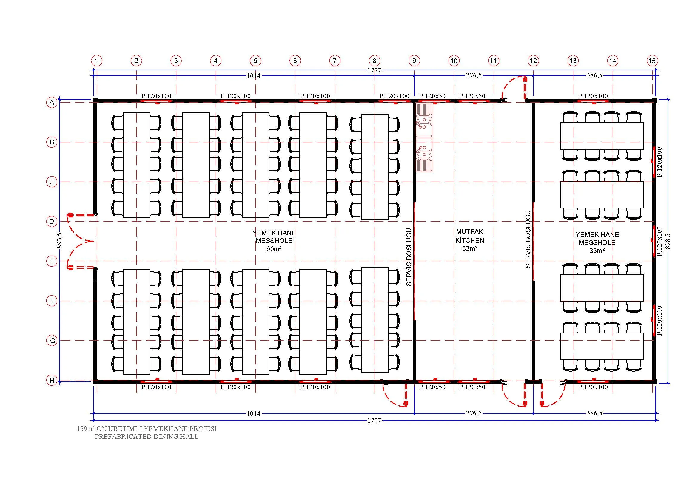 159 metrekare prefabrik yemekhane, büyük çaplı şantiyeler, fabrikalar veya eğitim kurumları gibi alanlarda kalabalık personelin toplu yemek ihtiyacını karşılamak için idealdir. Geniş yemek salonu ve yeterli servis alanı sunar.