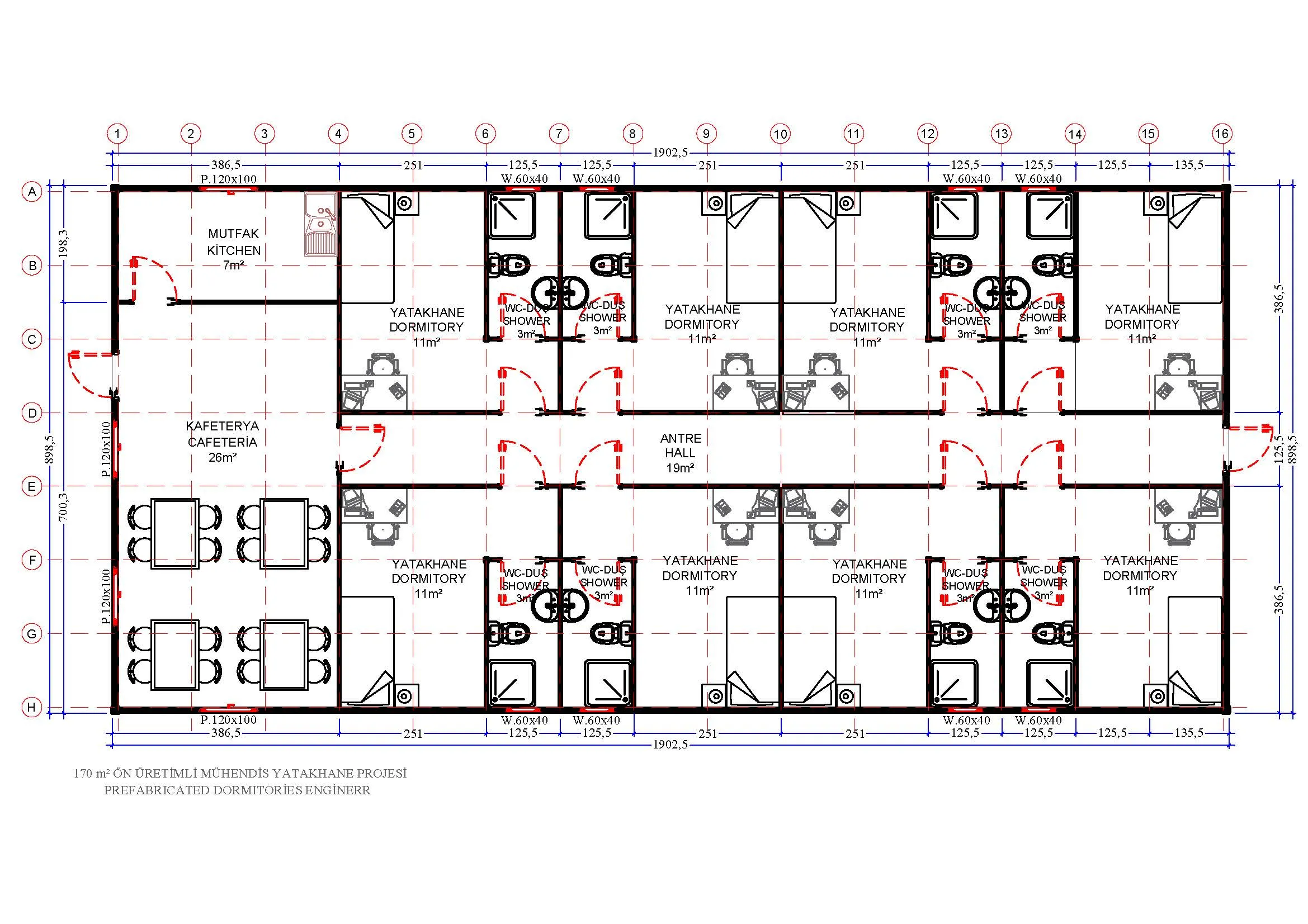 170 metrekare prefabrik yatakhane, belirli bir sayıdaki personelin veya çalışanın konforlu ve güvenli bir şekilde barınması için tasarlanmıştır. Hızlı kurulumu sayesinde acil barınma ihtiyaçlarına çözüm sunar.