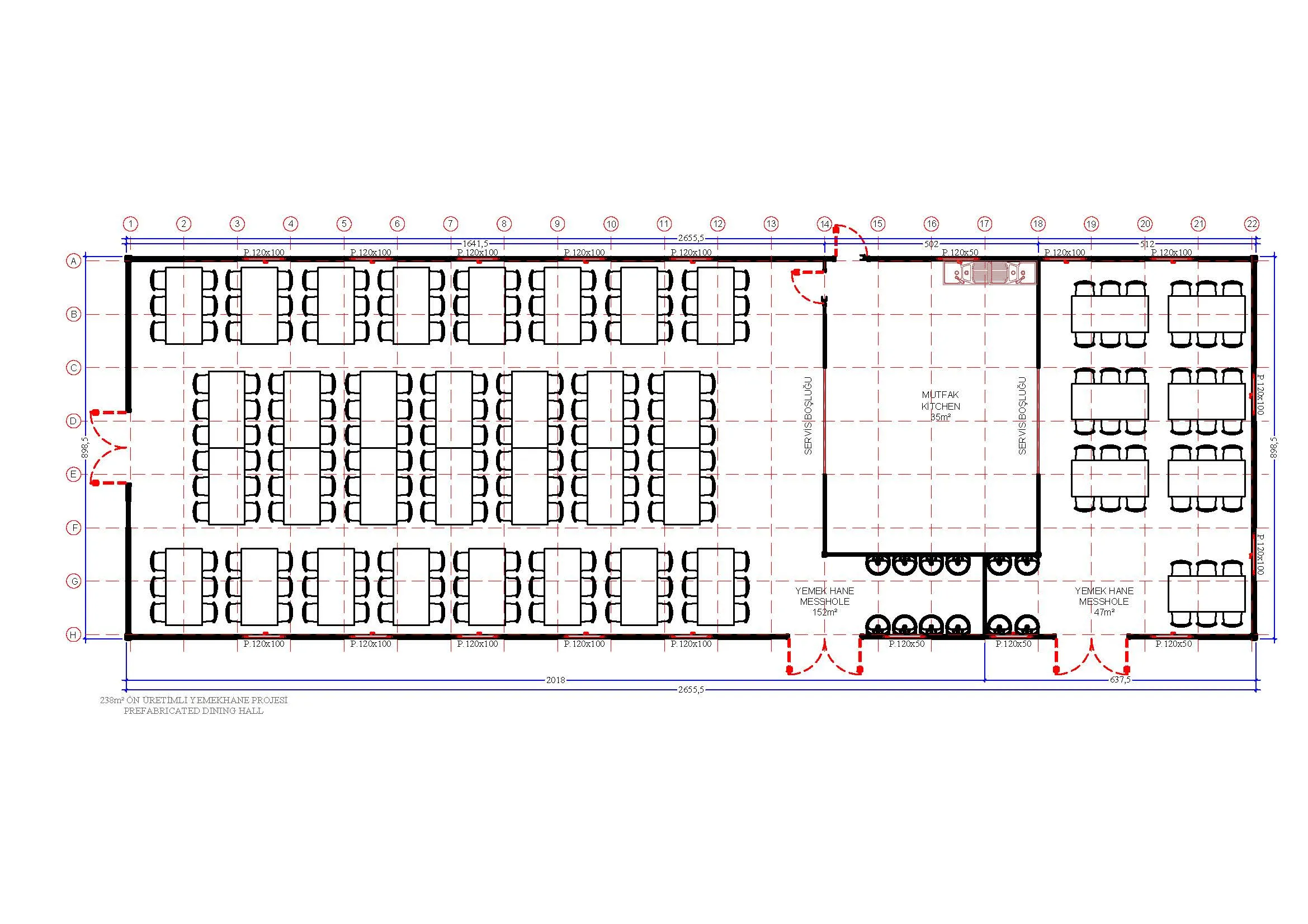 238 metrekare prefabrik yemekhane, çok sayıda personelin aynı anda yemek yiyebileceği, kapsamlı bir toplu yemek tesisi çözümüdür. Geniş yemek salonu, mutfak, depo ve servis alanları gibi tüm birimleri barındırabilir.