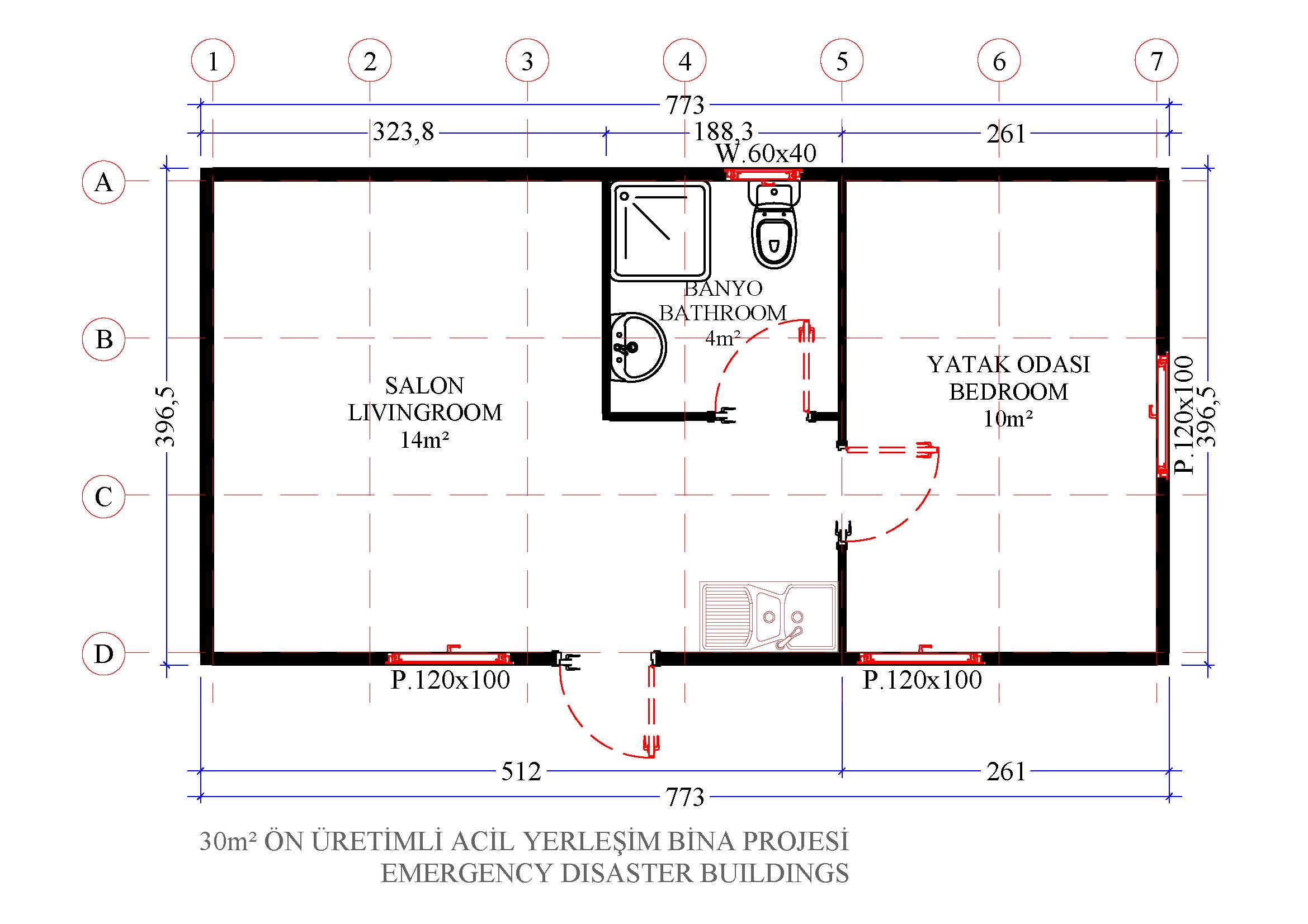 30 metrekare afet konutları, acil barınma ihtiyacı olan bireyler veya çekirdek aileler için tasarlanmış, kurulumu son derece hızlı ve ekonomiktir. Temel barınma ihtiyaçlarını karşılamak için idealdir.