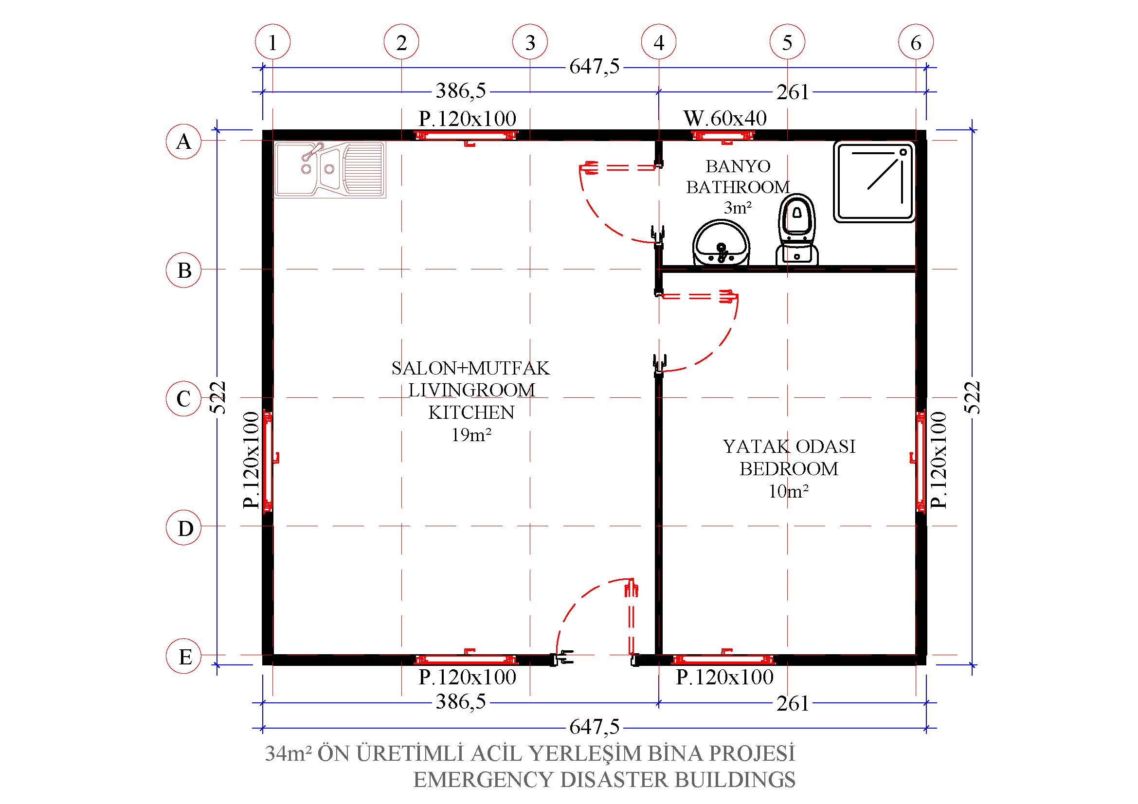 34 metrekare afet konutları, afet sonrası bireysel veya küçük ailelerin acil barınma ihtiyacı için son derece hızlı ve pratik bir çözümdür. Temel yaşam alanlarını en kısa sürede sunar.