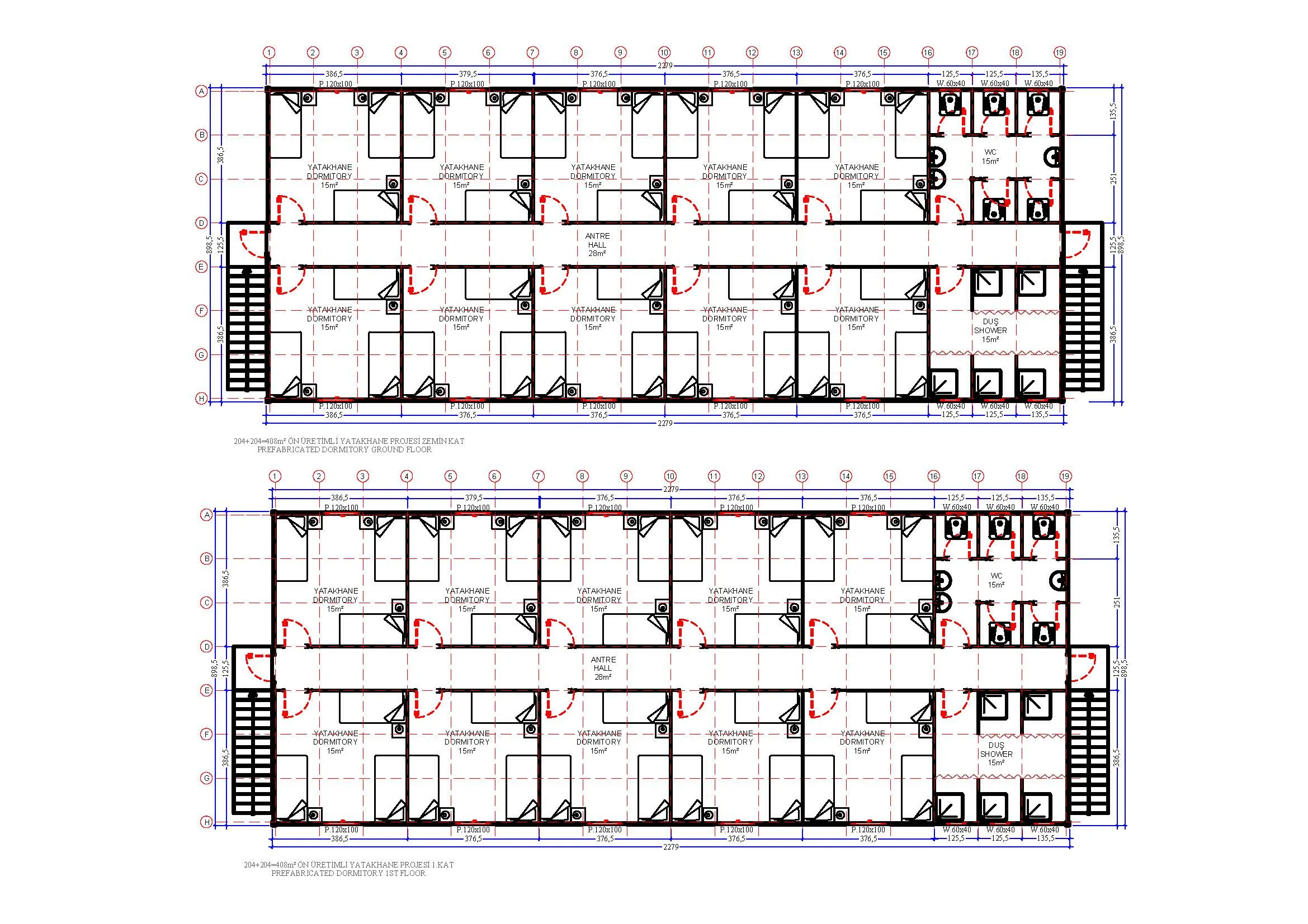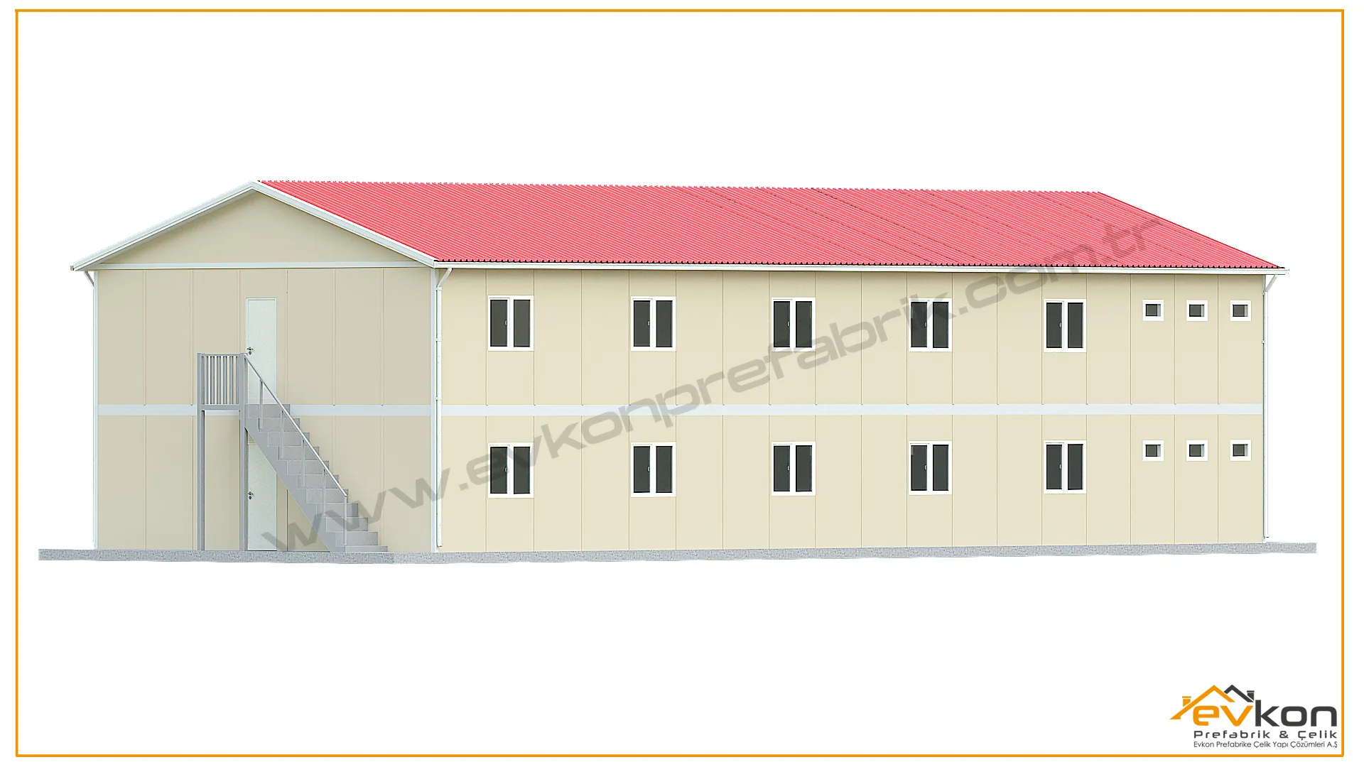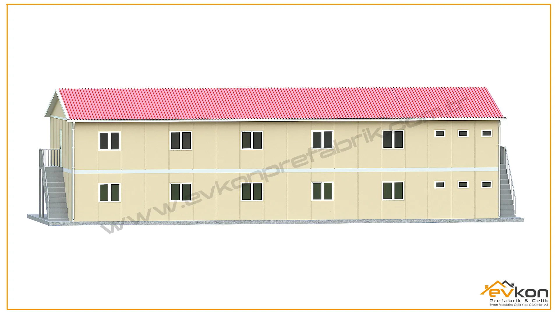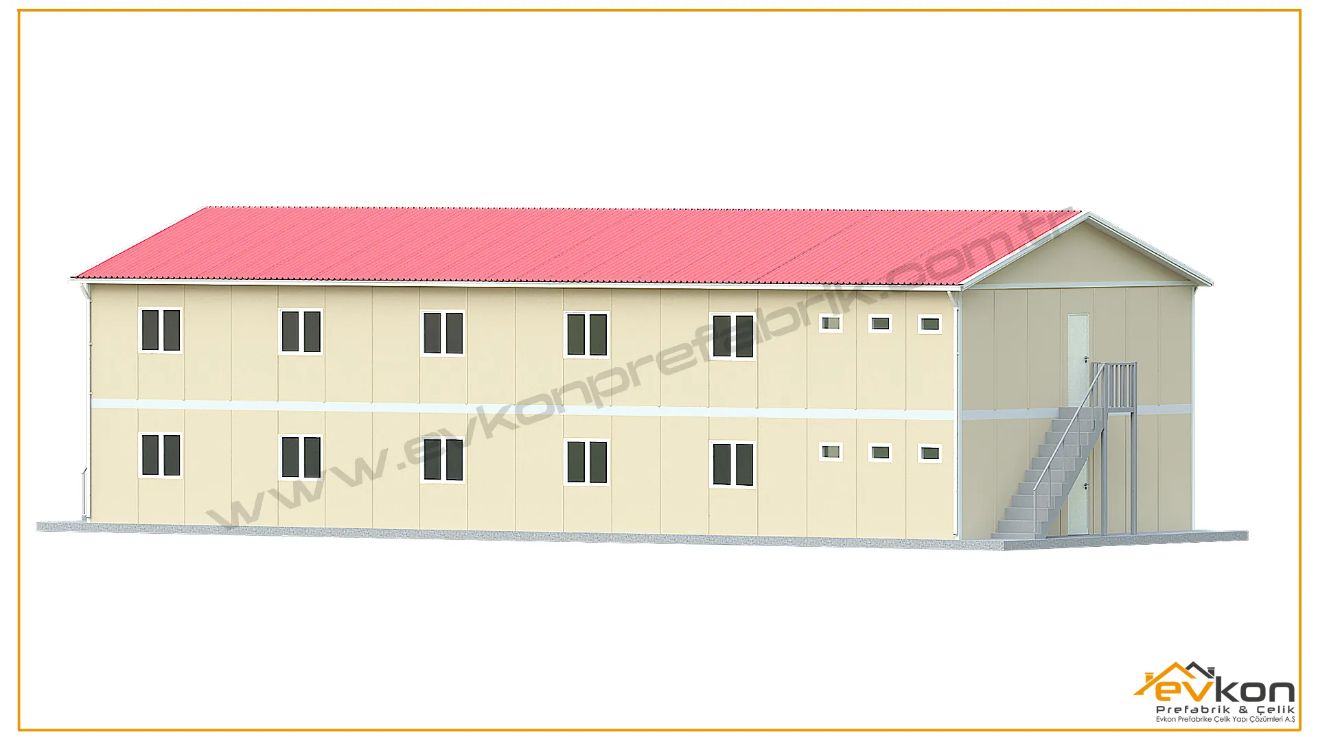 408 metrekare prefabrik yatakhane, şantiyeler, askeri tesisler, öğrenci kampları veya büyük ölçekli projeler gibi alanlarda kalabalık ekiplerin barınma ihtiyacını karşılamak üzere tasarlanmıştır. Geniş kapasitesiyle konforlu bir yaşam alanı sunar.