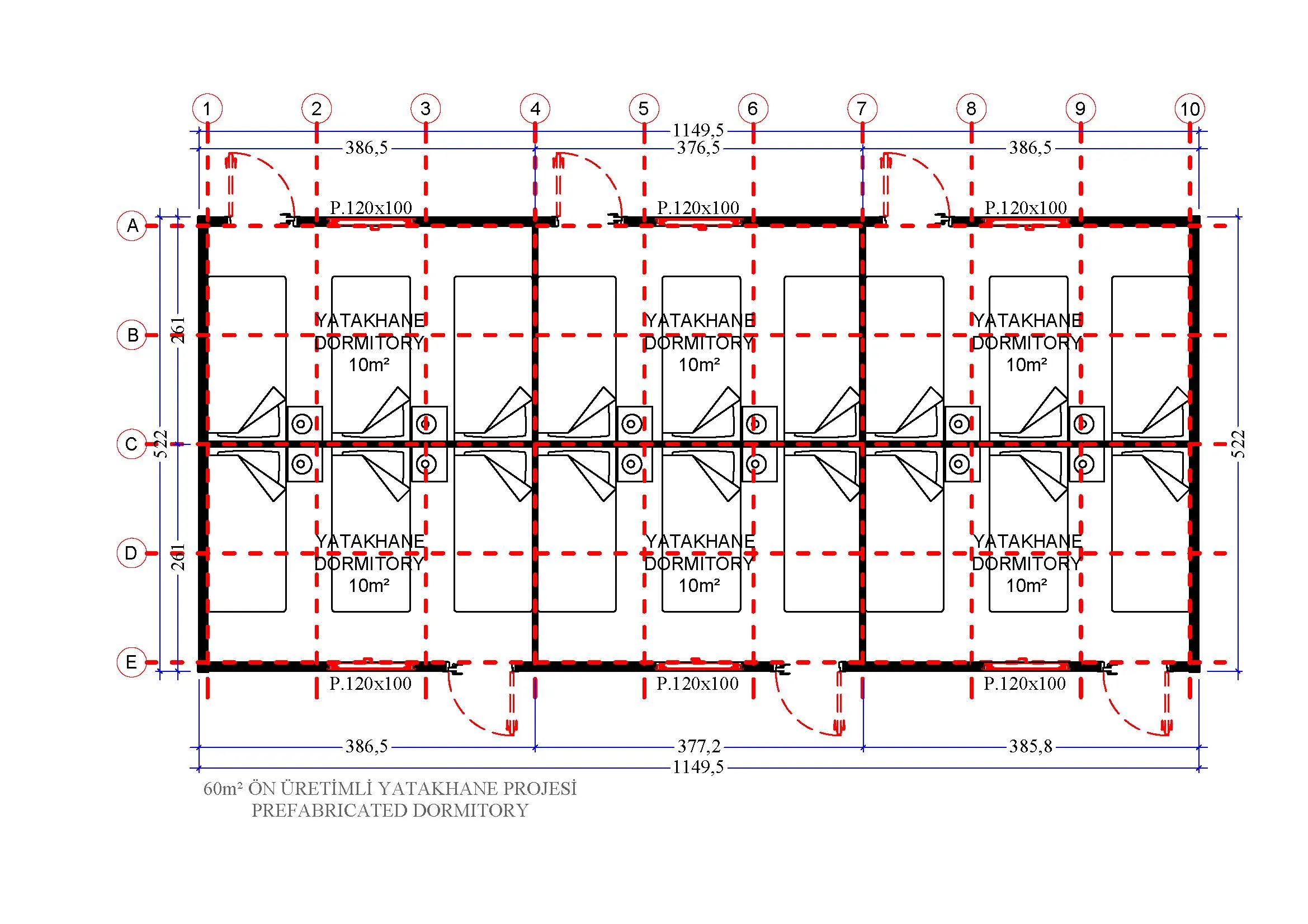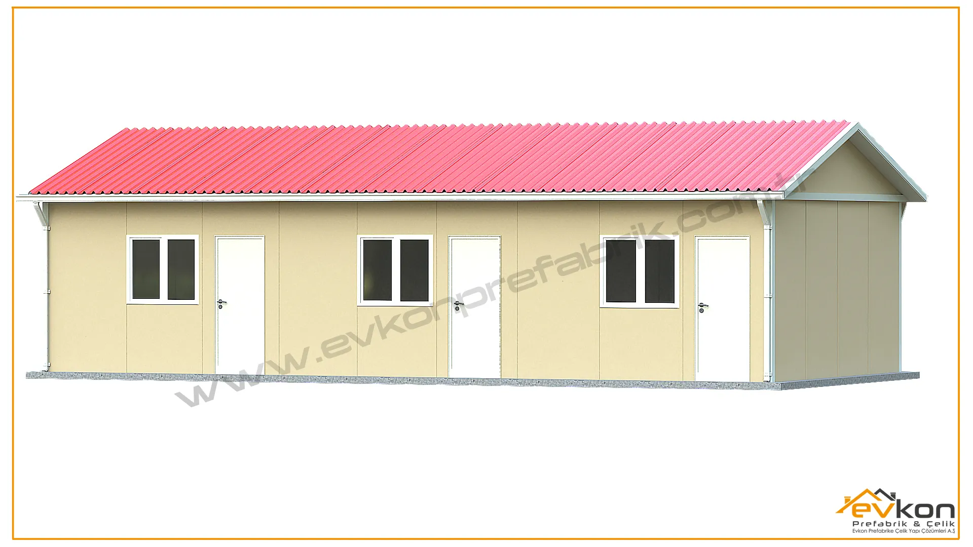 60 metrekare prefabrik yatakhane, acil durumlar veya çok küçük gruplar için ilk etap barınma ihtiyacını karşılamak üzere tasarlanmış, kurulumu en hızlı gerçekleştirilebilen ünitelerdendir. Temel barınma ve güvenlik ihtiyacını karşılar.