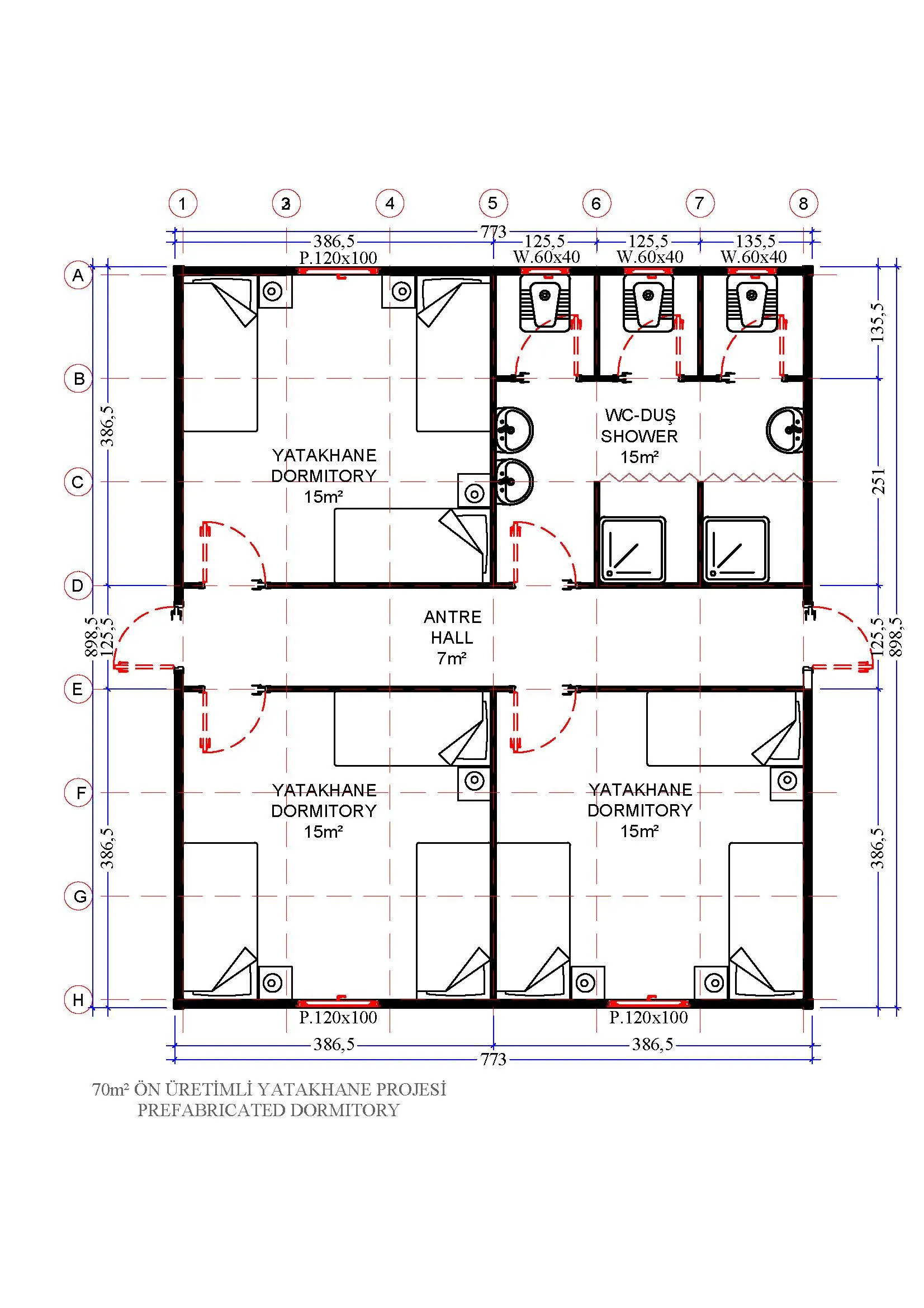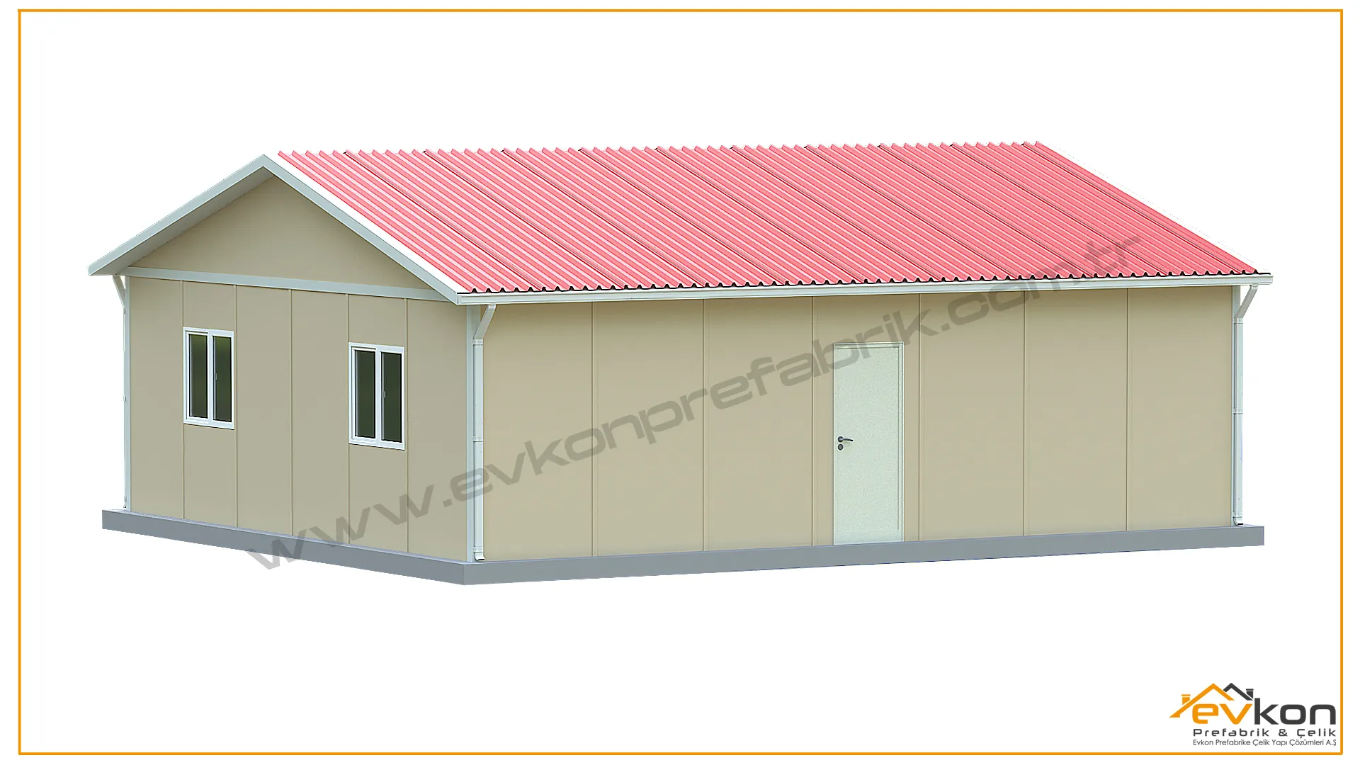 70 metrekare prefabrik yatakhane, acil barınma ihtiyacı veya çok küçük gruplar için tasarlanmış, kurulumu son derece hızlı ve ekonomiktir. Temel barınma ihtiyaçlarını karşılamak için idealdir.