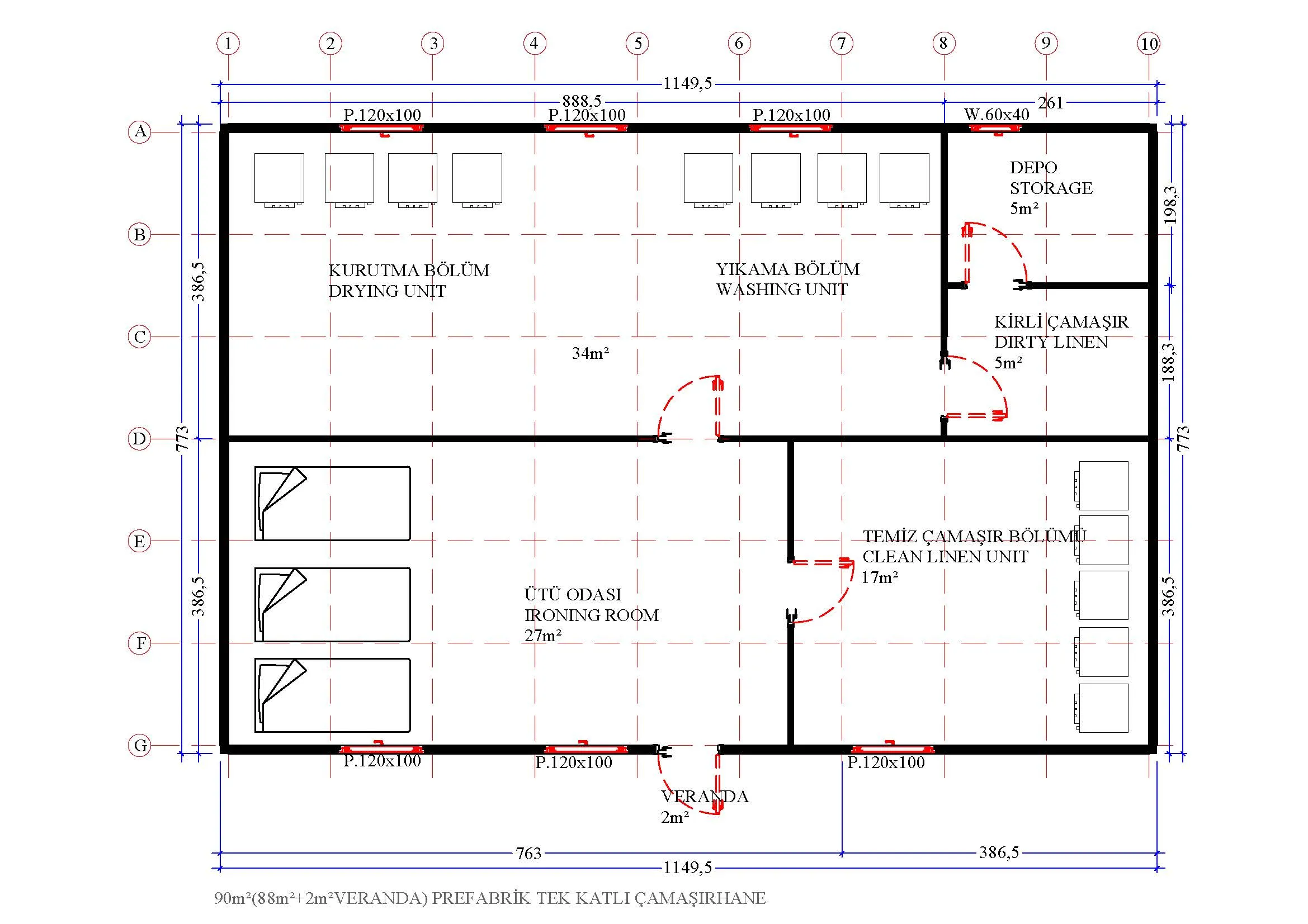 90 metrekare çamaşırhane projeleri, şantiyeler, öğrenci yurtları, askeri tesisler veya sanayi alanları gibi toplu kullanım gerektiren yerler için idealdir. Yoğun kullanıma ve nemli ortama dayanıklı malzemelerle üretilir.