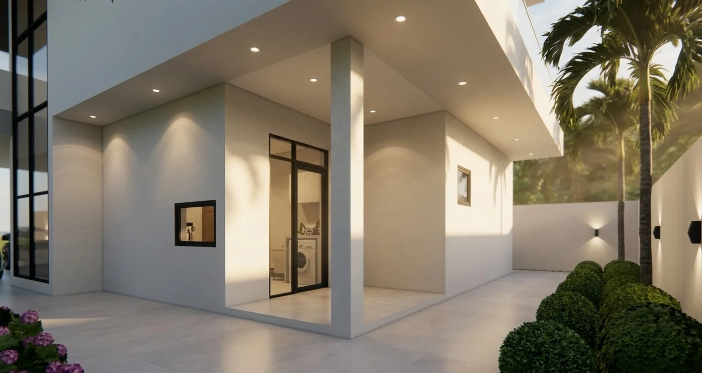 Dış: siyah kompozit panel + beyaz mineral bazlı sıva kombinasyonu