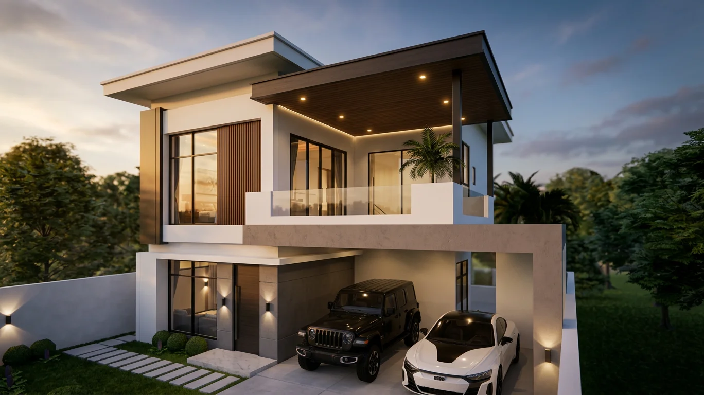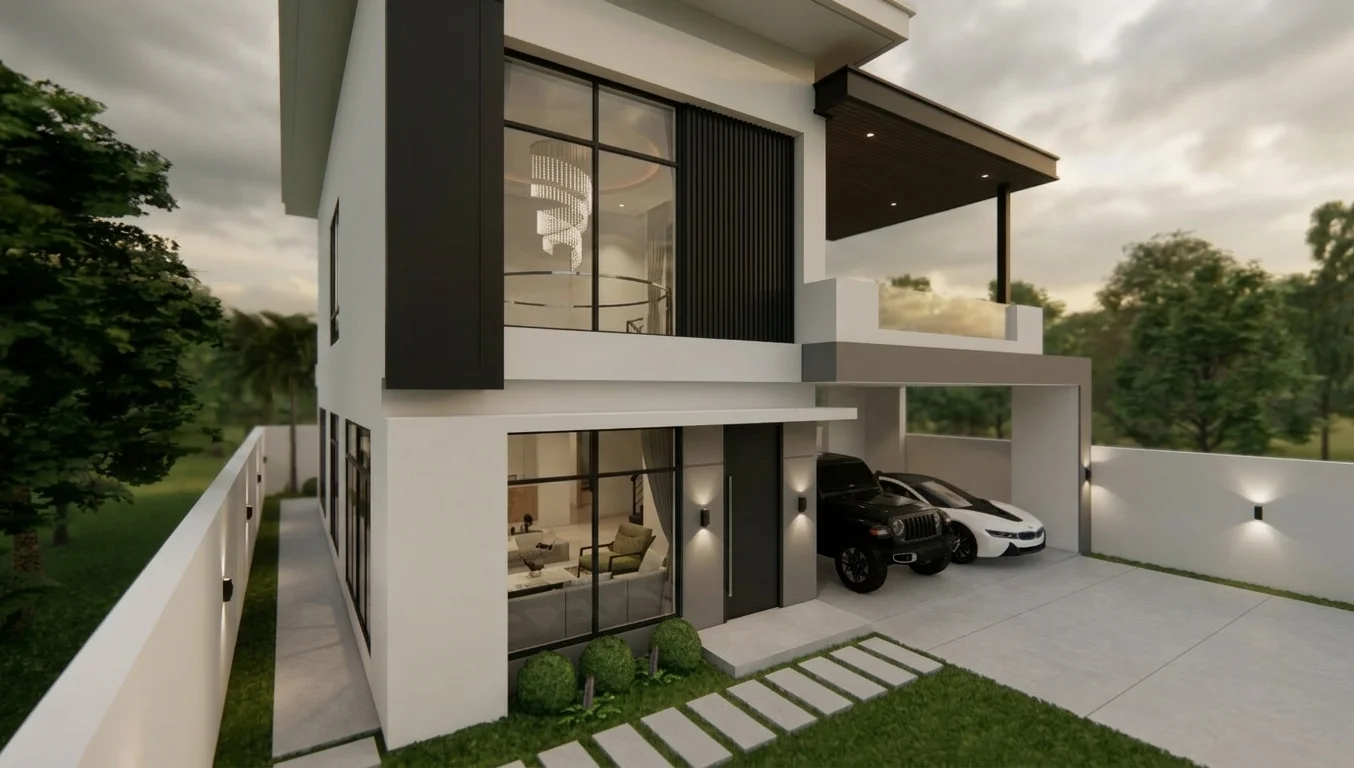 Siyah-beyaz lüks cephe, çift araçlık kapalı garaj ve üst kat terası ile 200 m² iki katlı çelik villa.