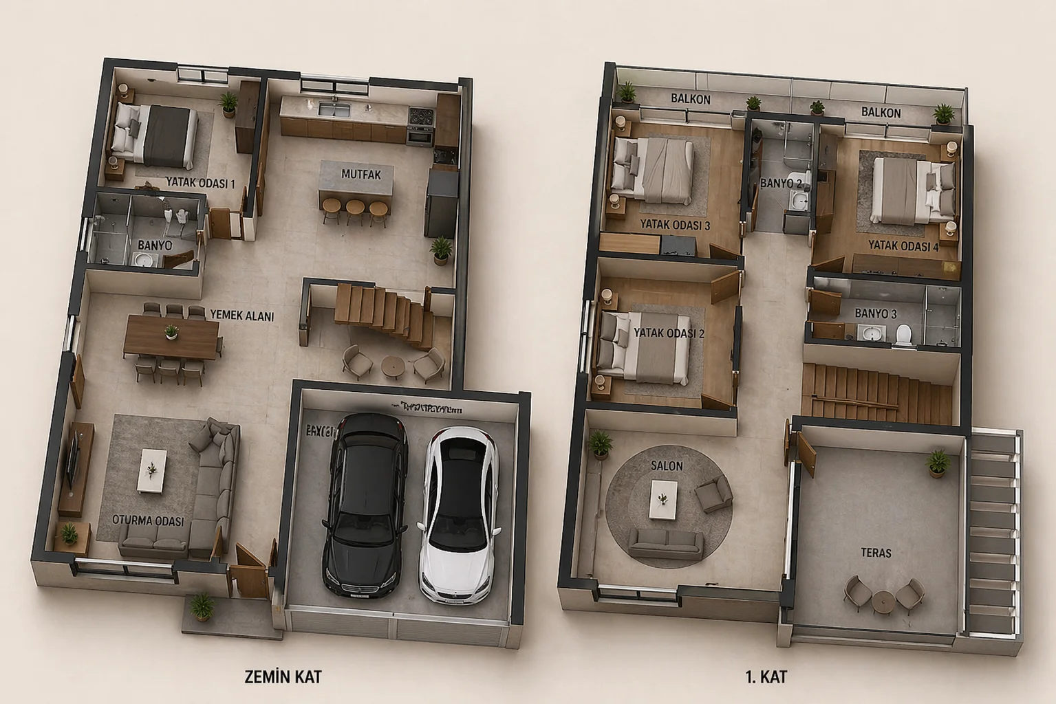 Zemin: Oturma+TV odası, açık mutfak+yemek, çift araçlık kapalı garaj, giriş hol