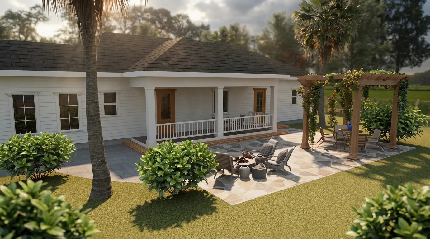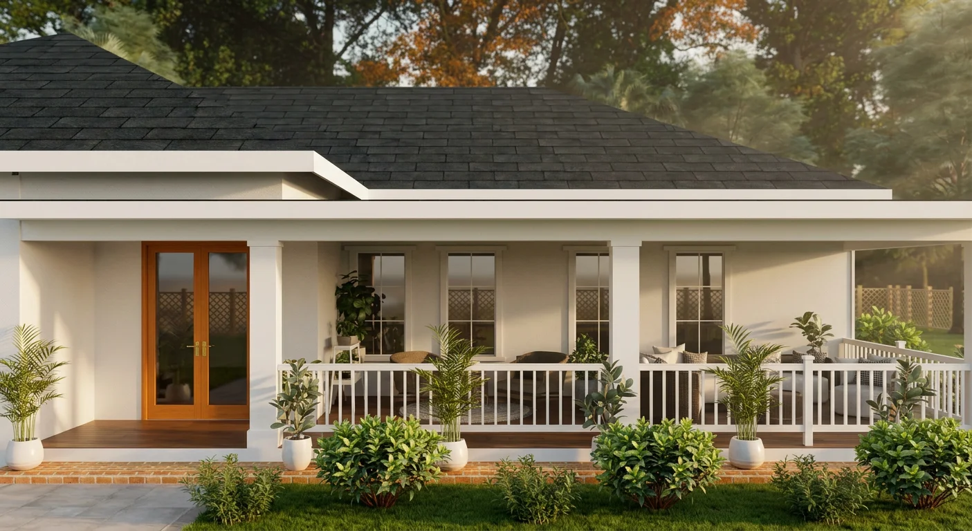 Sütunlu geniş veranda, beyaz sıva cephe ve betopan iç kaplama – ailenizin güvenli ve konforlu sığınağı.