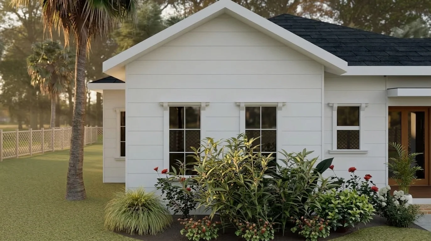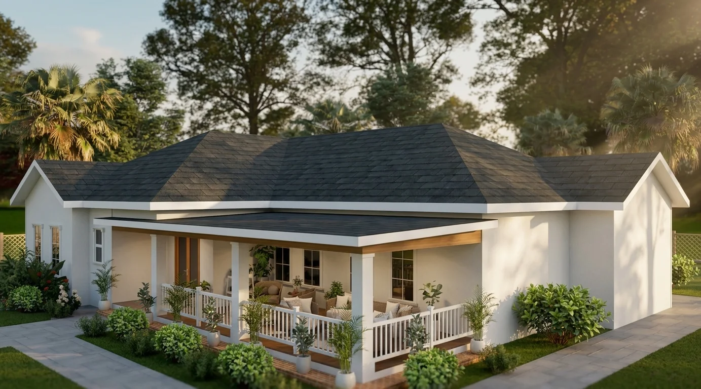 150 m² kolonyal tarzı çelik ev, Akdeniz ve güney iklimlerine özel geniş saçak ve sütun düzeniyle tasarlanmıştır. Beyaz dış sıva yerine iklim adaptif boya sistemi (silikon bazlı, yansıtıcı, UV dayanımlı 10 yıl garanti) uygulanmakta; bu sayede yazın çatı yüzeyinde ısı birikimi azaltılmaktadır.