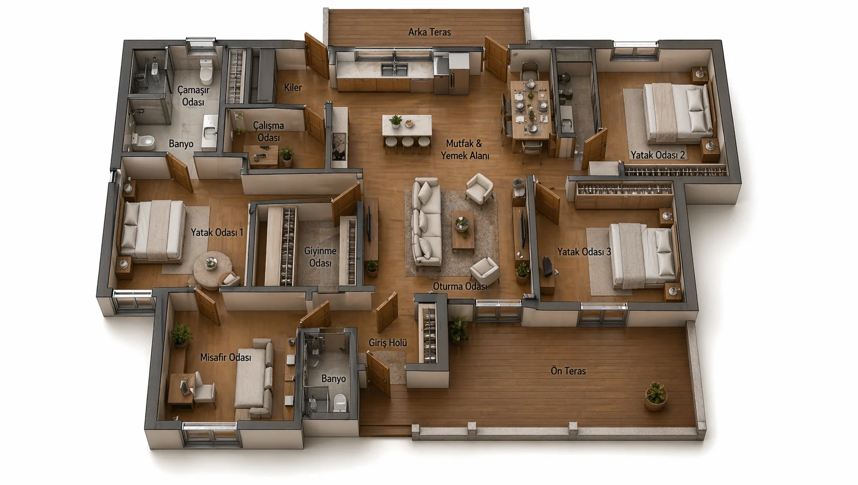 3 yatak odası (ebeveyn ~16 m², diğerleri ~12 m²)