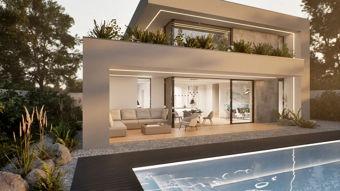 Çelik konstrüksiyonun sınırlarını zorlayan 220 m² lüks villa; yüzme havuzu, çatı bahçesi ve akıllı ev sistemi ile.