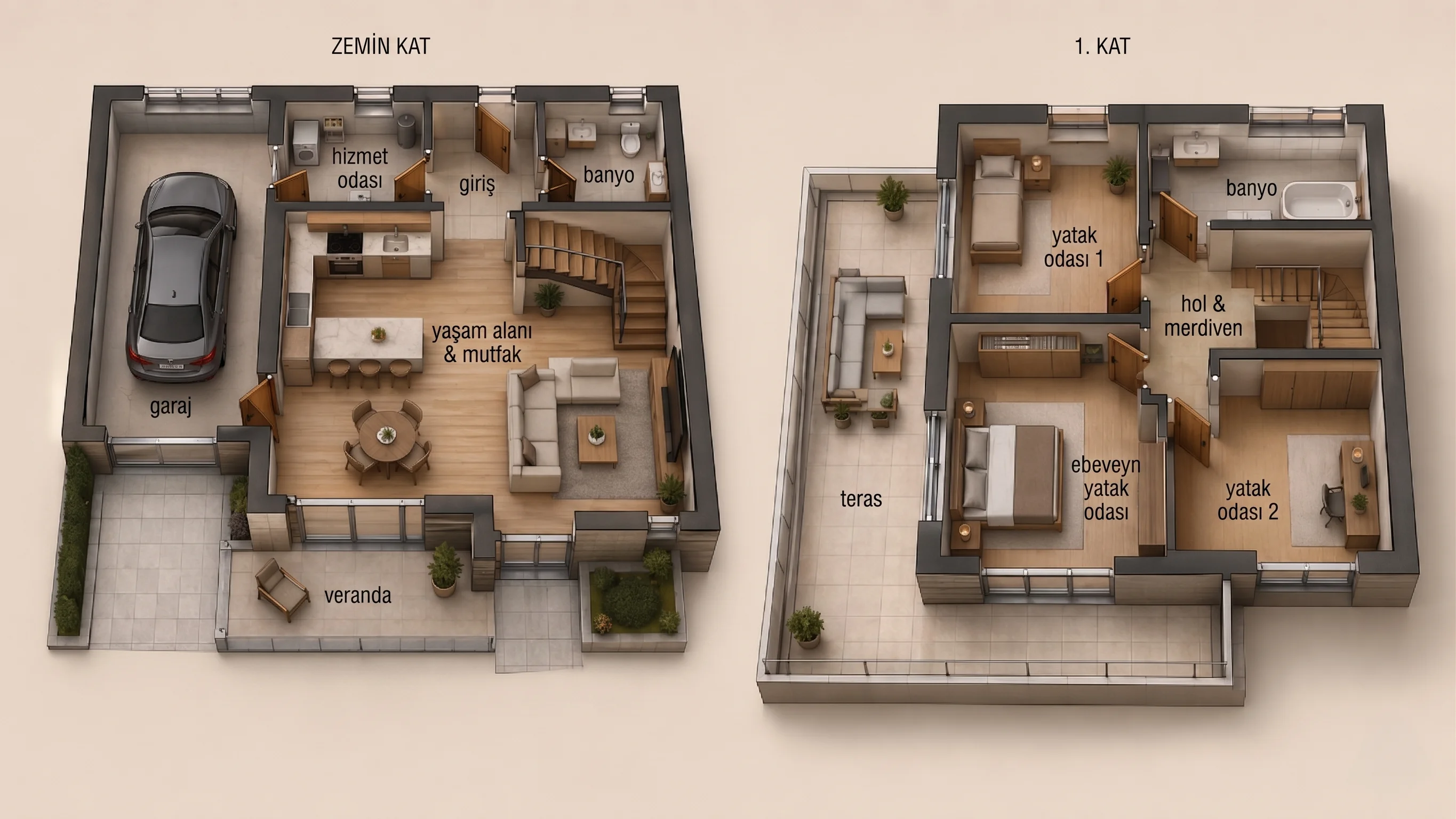 Zemin: Geniş yaşam alanı + açık mutfak, yemek, hizmet odası, garaj, veranda